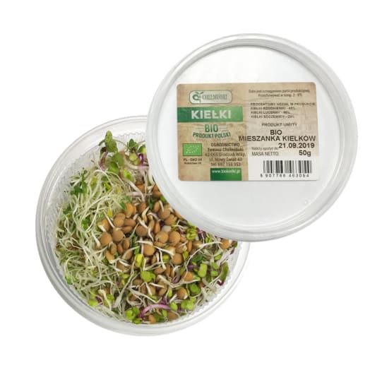 Mieszanka kiełków BIO. Jest mieszanką kiełków: rzodkiewki (40%),lucerny (40%) oraz soczewicy (20%). Połączenie pikantnych kiełków rzodkiewki, łagodnych kiełków lucerny oraz bogatych w kwas foliowy kiełków soczewicy.