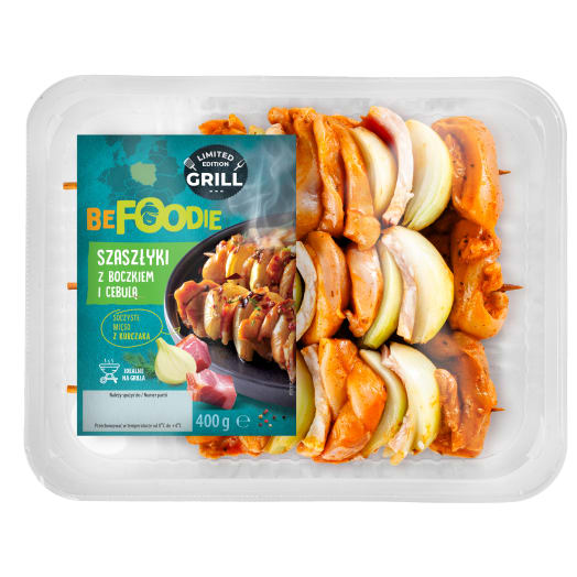 Szaszłyk z mięsa bez skóry z nogi kurczaka w marynacie na grill z cebulą i boczkiem wędzonym. Produkt zapakowany w atmosferze ochronnej.